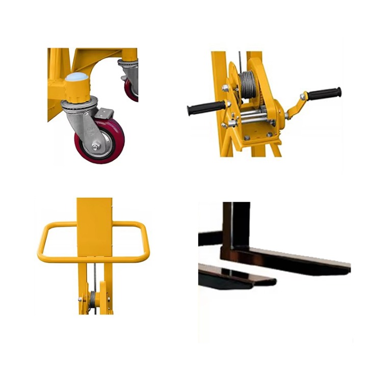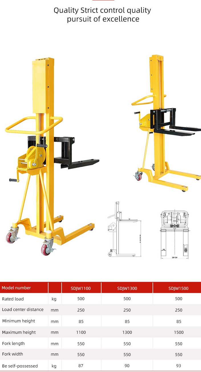500 кг қолмен паллет Стакабер Қол құрылғысын бұру арқылы оператор жүк шебін көтеру немесе түсіру үшін ішкі механикалық құрылымды басқарады, осылайша жинақтағыштың жиналу жұмысына қол жеткізіңіз.